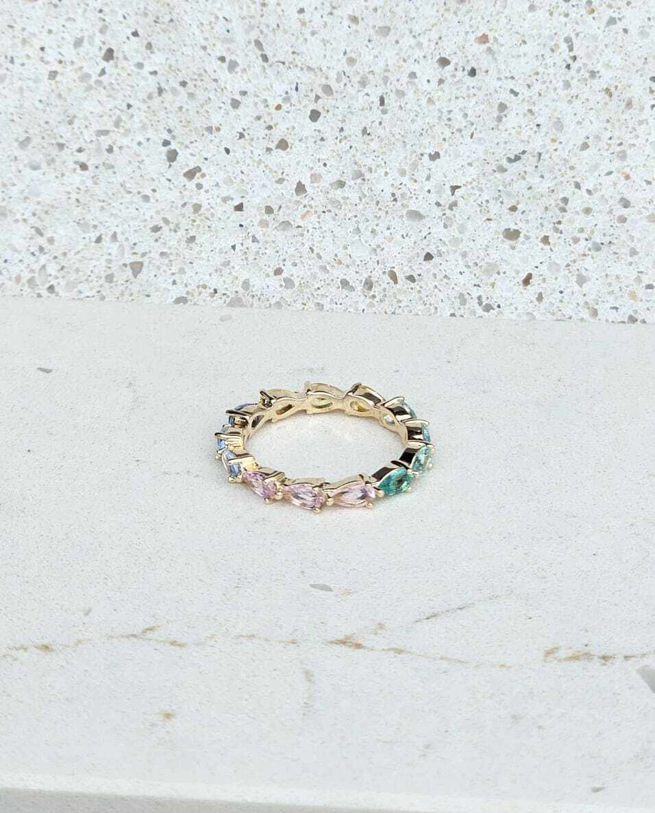 O Anel Inteiro com Cristais em Gota de Citrino, Paraíba e Quartzo Rosa, banhado a ouro 18k, é uma peça vibrante e cheia de personalidade. Seu design moderno apresenta uma sequência harmoniosa de cristais coloridos em formato de gota, que refletem brilho e leveza a cada movimento. Com tons que variam do amarelo radiante ao azul tropical e rosa suave, este anel é perfeito para compor produções elegantes, cheias de cor e estilo.